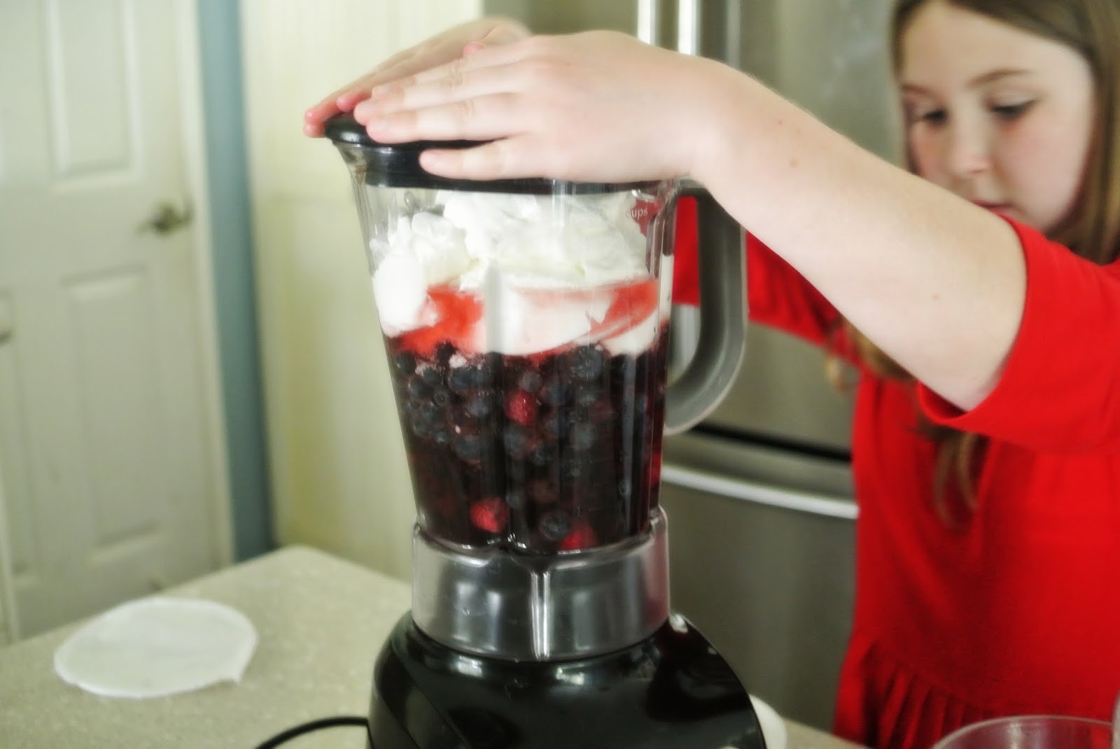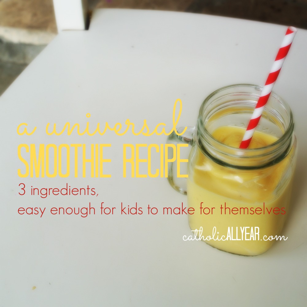It turns out that a very easy, three ingredient recipe works for pretty much any type of smoothie, and that my kids eight and over are all capable of making it completely on their own.