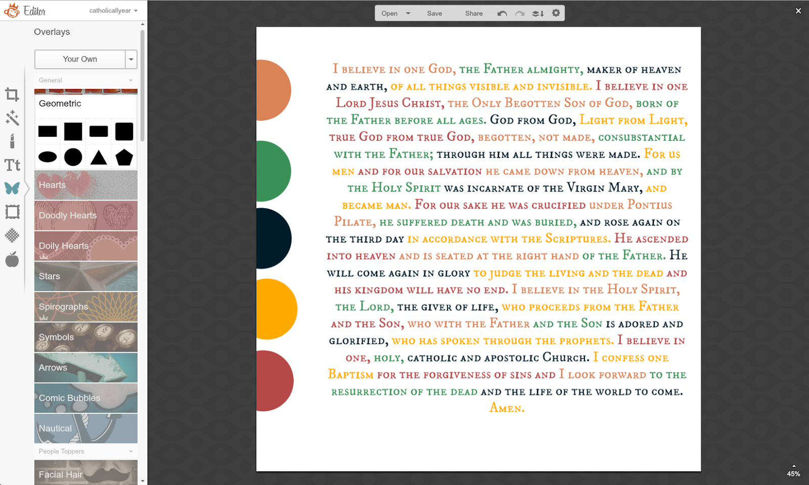 4. Then I made myself a color palate. From the Overlays Menu, I went to Geometric. I wanted five colors, so I put five circles onto my image, then I selected a different color for each circle, playing around with it until I had a group that I liked together. Then I shoved them way over to one side. I also resized my text box a bit, so I could get to the whole thing.