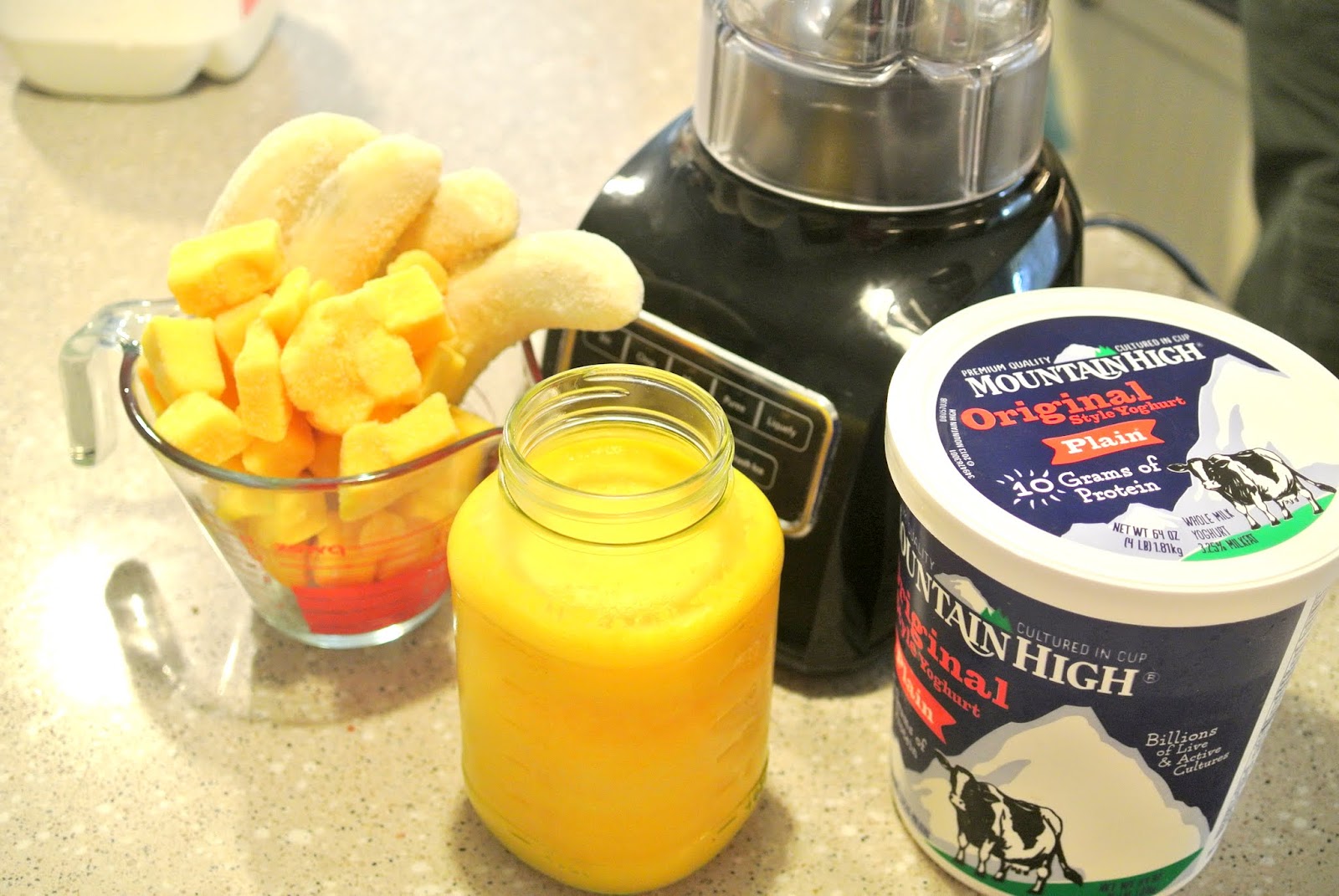 Another good one is frozen bananas (I don't even like bananas, but you can't really taste them) and mango, leftover fresh squeezed orange juice from our Sunday breakfast, and yoghurt.