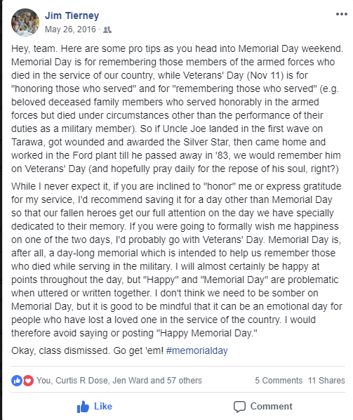 While I never expect it, if you are inclined to "honor" me or express gratitude for my service, I'd recommend saving it for a day other than Memorial Day so that our fallen heroes get our full attention on the day we have specially dedicated to their memory. If you were going to formally wish me happiness on one of the two days, I'd probably go with Veterans' Day. Memorial Day is, after all, a day-long memorial which is intended to help us remember those who died while serving in the military. I will almost certainly be happy at points throughout the day, but "Happy" and "Memorial Day" are problematic when uttered or written together. I don't think we need to be somber on Memorial Day, but it is good to be mindful that it can be an emotional day for people who have lost a loved one in the service of the country. I would therefore avoid saying or posting "Happy Memorial Day."