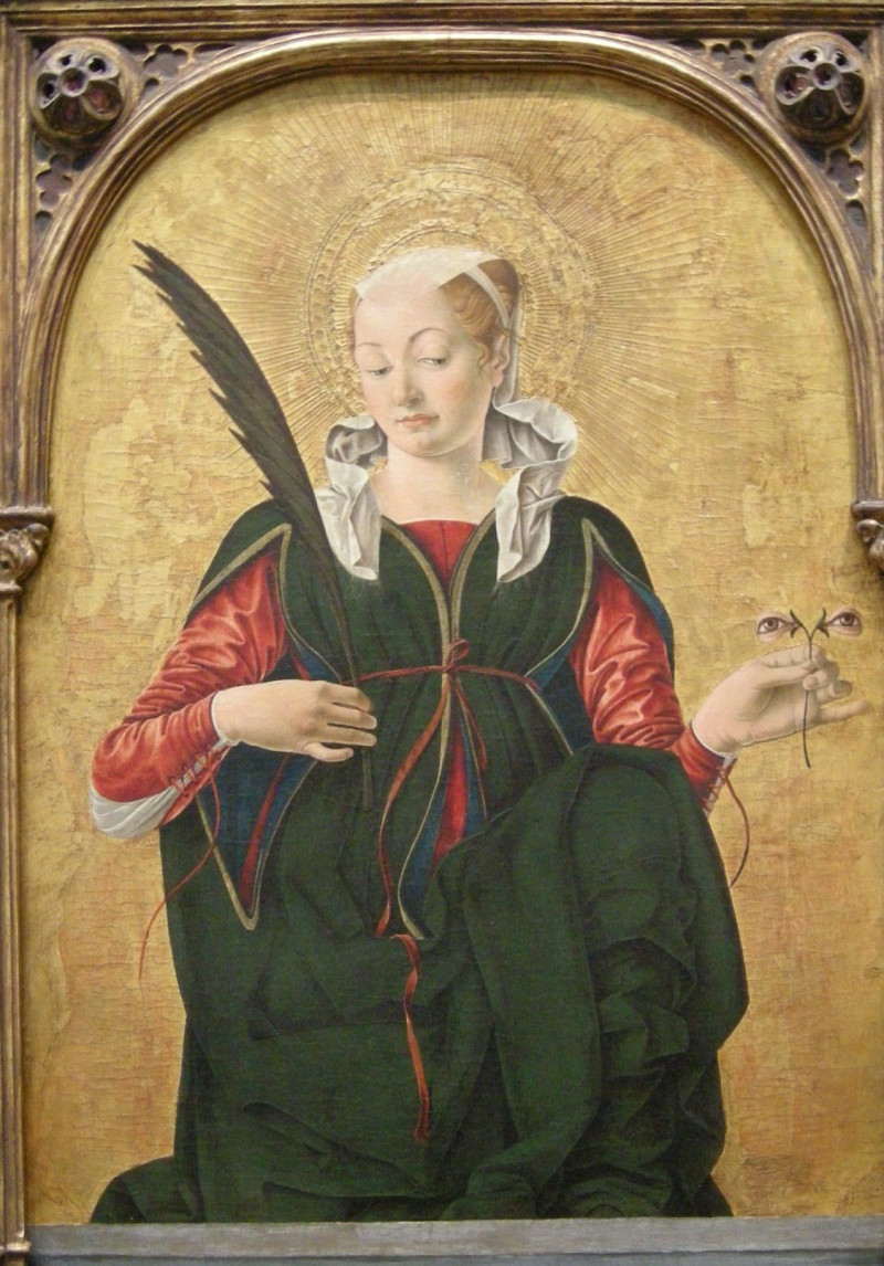 The sorrowful heart on this dress is WAY cool and I would totally rock it at next year's All Saint's Day Pageant. I also am totally there for her St. Lucy's eyes on a stick.