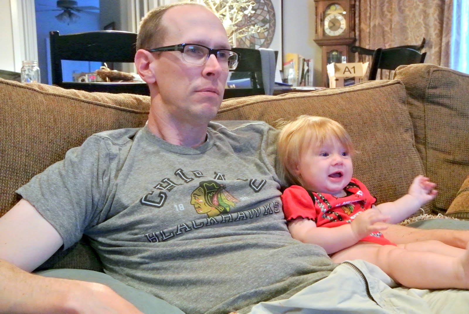 Lulu and Daddy watching the 'Hawks.Lulu doesn't really talk. And she's not a very good TV watcher. She'll hang out for a minute or two, then roll herself off the couch and crawl off to find me, which pretty much defeats the whole purpose of owning a TV, if you ask me.