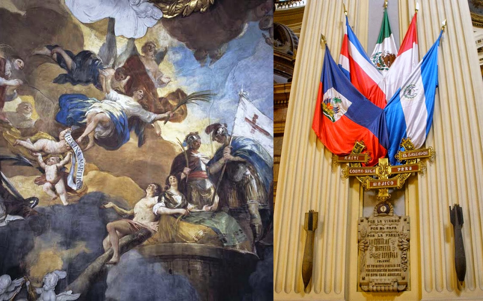 Also awesome: During the Spanish Civil War of 1936–1939 three bombs were dropped on the church but none of them exploded. Two of them are still on show in the Basilica. And if you look in the upper left corner of this fresco by Goya, you can see where one came through!