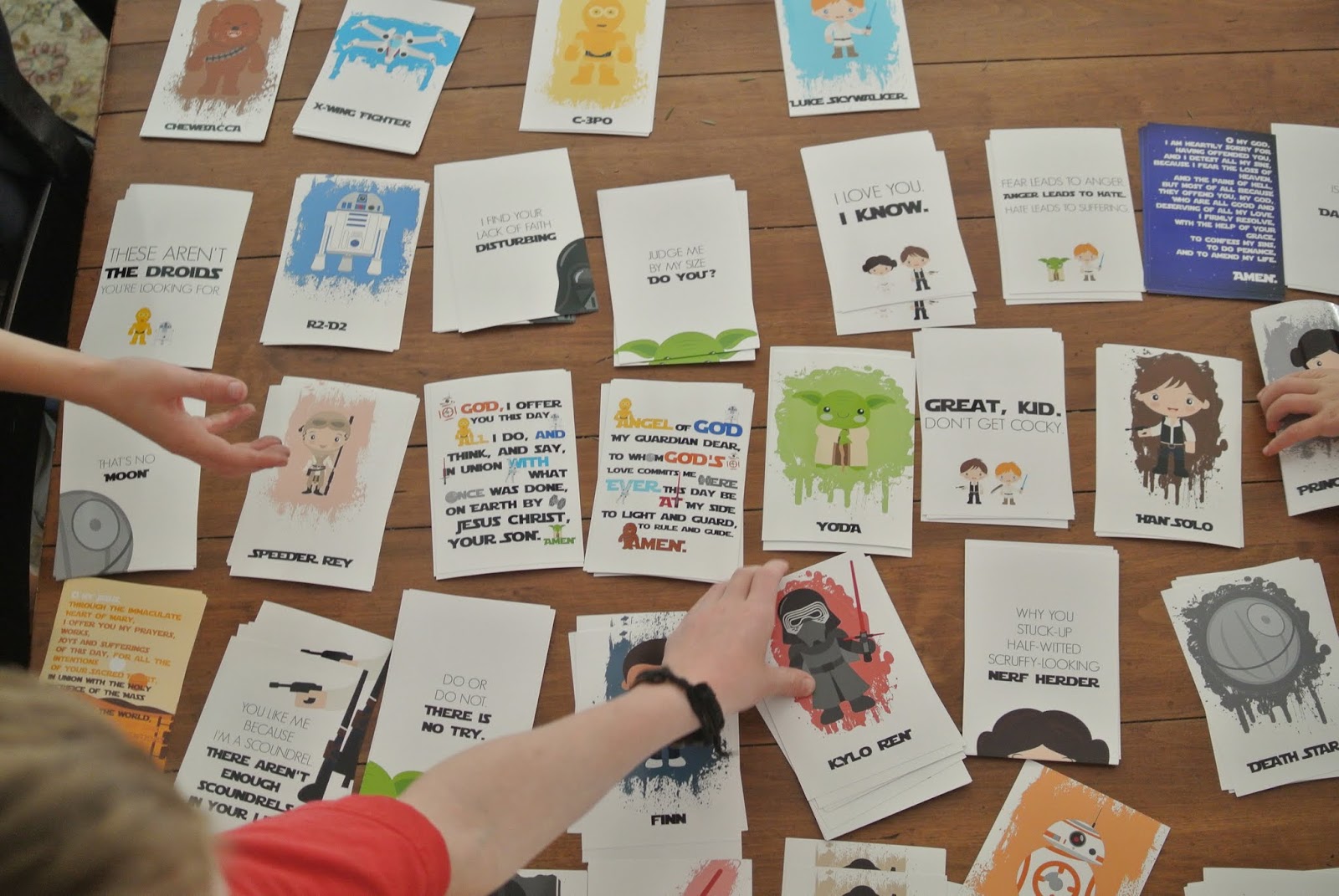 Bobby designed 4x6 Star Wars character trading cards in PicMonkey, and we had them printed up at the one hour photo place (I threw in some of the quotes and prayers I made as well). They turned out really cute and the kids had a blast playing with them.
