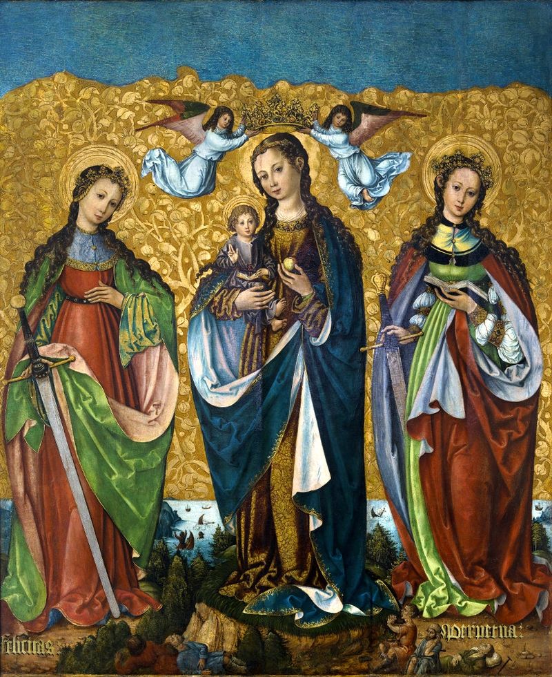 Newlyweds, martyred together during the persecution of Christians under the Roman Emperor Diocletian also around 300. It's all very romantic.