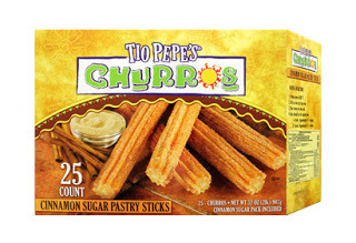 The traditional side to the chocolate is churros, which are a long, fried, donut-type pastry. They sell them frozen at grocery stores around here, and they come with a special little tube you can microwave them in, so they come out crunchy. Then you roll them in cinnamon and sugar.