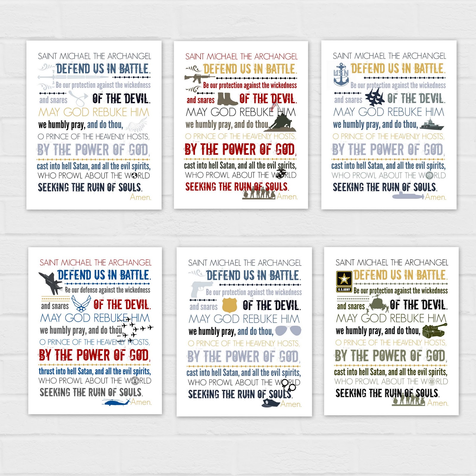 The St. Michael PrayerMarine Corps Navy Air ForcePoliceArmyAND I made them into printable two-sided Holy Cards, that you can download and print at home or at your local copy shop. They print well in color or in black and white.