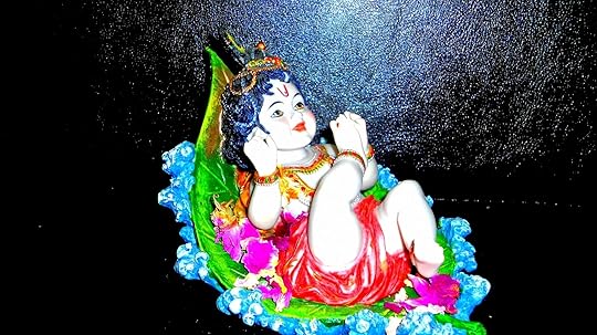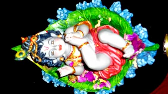 The child was dark in colour with curly locks which framed its face. Its eyes looked mischievous as we looking for butter to steal. It lay on the banyan leaf sucking its big toe. The sage recognized the Lord. It was as if the Lord wondered why people sought his divine feet; to test if they were sweet, He was sucking on His big toe. Mesmerized by their sweetness, He lay they enjoying His toe.The sage waded near the Lord to pick the child up. The child looked at the sage with love and opened its coral lips. As we pulled in by a vacuum, the sage entered the baby’s mouth and went into His belly. With a jerk the sage got-up and saw that he was back at his ashram and everything was back to normal!This shows that the Lord keeps us safe in His belly even during pralayam and lets us out once creation begins.Continued On:
