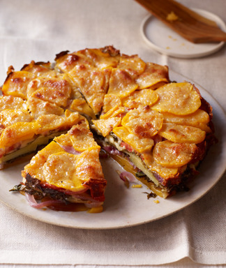 Heat oven to 425°F. Oil a 9-in. springform pan. Arrange half the butternut squash in the bottom of the pan, in concentric circles. Top with half the onion, separating the rings. Top with half the kale, drizzle with half the oil and season with 1/4 tsp salt. Top with the potatoes and half the provolone cheese.