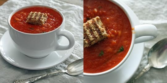 Is it something about our childhoods that has made tomato soup with grilled cheese croutons the rage? A terrific tomato soup can be made with 3 cups vegetable broth, a 28 oz. can of tomatoes (chopped) with added fresh parsley and basil. The grilled cheese croutons from rustic whole grain bread and lighter American or cheddar is appetizing. Calories per serving is 200.