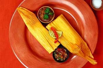 8. Assemble the tamales by flattening a corn husk on your worktable. Spread one ball of dough over the husk leaving a 1-inch margin on all sides. Add about 2 tablespoons of filling to the center. Roll up lengthwise into a cylinder and wrap with the corn husk. Secure the ends by tying with a strip of husk. Repeat with remaining dough, filling, and husks.