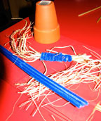 Wrap strips of Raffia with blue pipecleaner. (Two pipecleaners per arm) once you are done wrapping trim the “hands” with scissors to make them even.