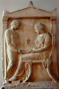Nothing compares to the ancient Greeks who developed the earliest commemorative funerary architecture in Europe and the Middle East. As in ancient Rome, the dead were buried outside city walls, along roadways entering the city, in highly visible funerary monuments to preserve an individual’s fame, family honor, and standing in society. The Grave Stele of Hegeso, Athens, c. 410 – 400 BCE is marble, 5’2″ high and is now in the National Archaeological Museum, Athens. Hegeso was wealthy enough in life to have one of her servants hold her jewelry box for her to select something, and in death for someone to pay for this touching, and rewarding relief or stele. Isn’t this a beautiful piece? The tomb was a meeting place for the living and the departed, and families would hold feasts at the tomb, putting out food and drink for the dead to enjoy.