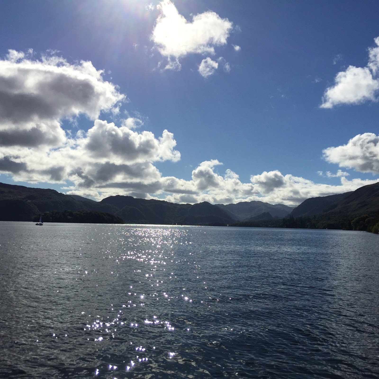 Looking down into the Jaws of Borrowdale with the sun sparkling onto the lake.