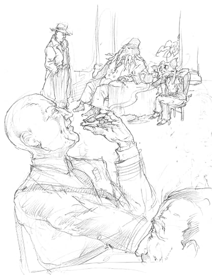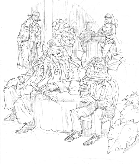 Well, the time has come to announce Dan O’Brien’s latest project: Mobsters, Monsters & Nazis: a collaboration between Dan O’Brien and Steve Ferchaud, who illustrated Conspirators of the Lost Sock Army and the Loose Change Collection Agency. What I am revealing today is the sketches for some of the interior illustrations (which will be black and white) of the first issue. It will be released as six issues (eBooks) starting on Halloween. It is influenced by film noir, pulp comics, and an abiding love of Lovecraft. It is now available for pre-order and Dan will be promoting it heavily starting in the month of October. He would love to hear what you think of it so far! Visit him at: http://thedanobrienproject.blogspot.com/ or on Twitter, @AuthorDanOBrien