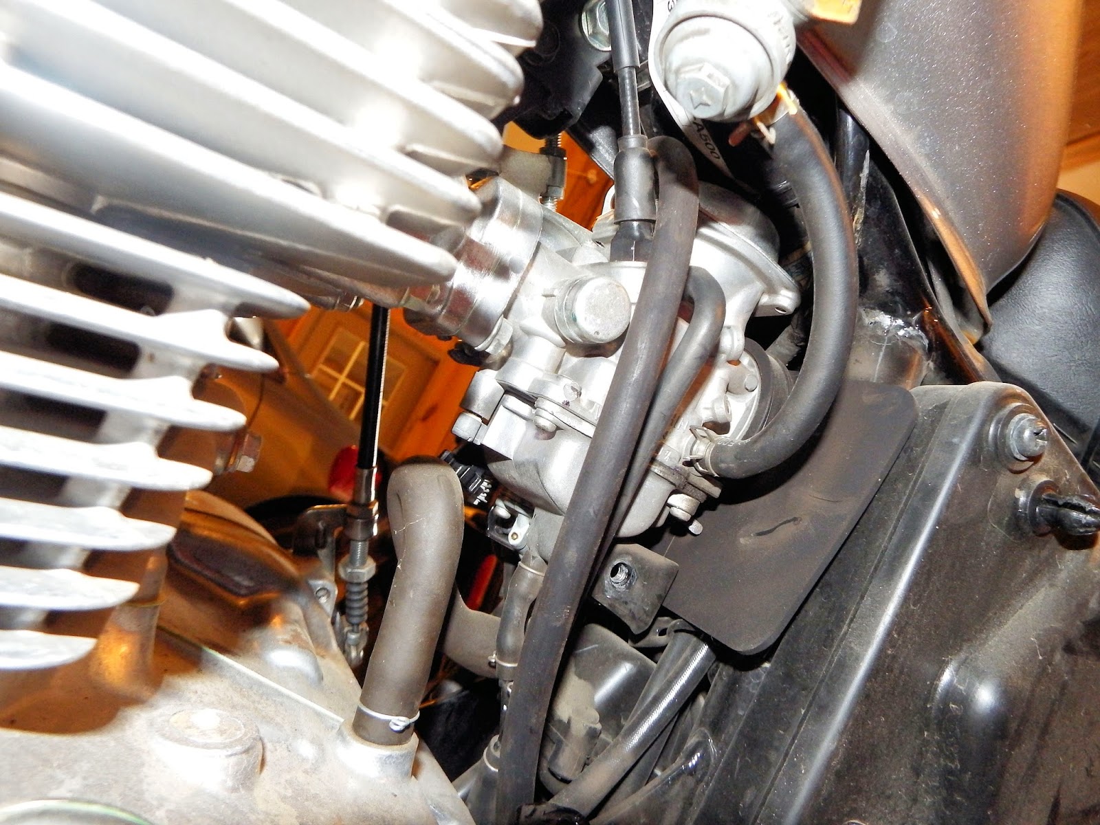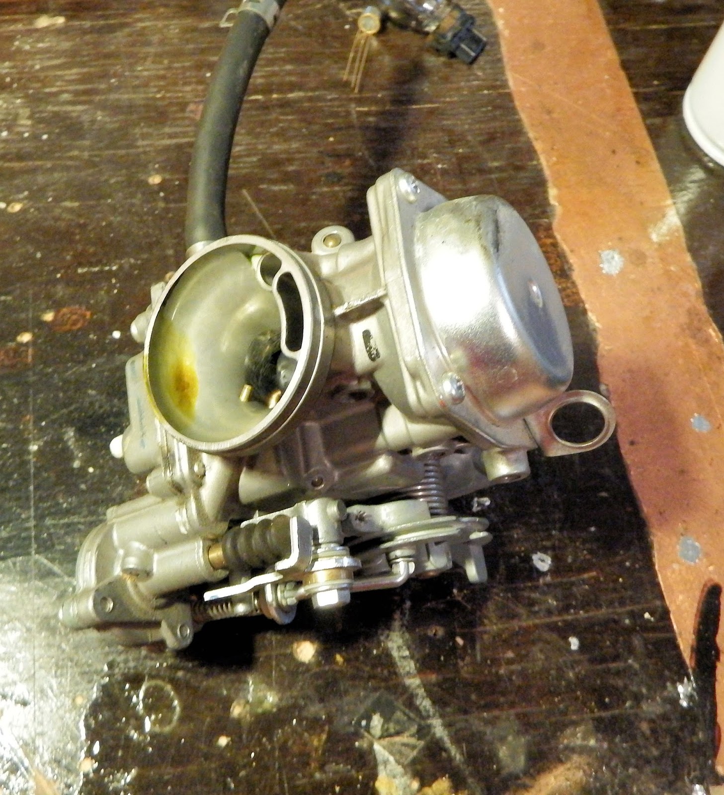 Fig. 1, a carburetor. Or maybe that's a pasta maker. Frankly, we're not sure, but if the bike emits perfect angel hair pasta instead of exhaust we'll know why.The book I bought is a Kindle book, and at first I was apprehensive about using it around oil, gas, and tools. But now that I've done it, I find that having good clear photos I can enlarge and clickable hyperlinks and a working TOC makes repairs much easier than trying to leaf through a dog-eared printed manual. I wasn't able to clean my idle jet (see how I toss around mechanical terms as though I've been doing this for years), so I ordered a new one. Total cost of repairs: $23. I haven't put the bike back together yet, but if she cranks I'll have spent about six hours repairing it and less than twenty-five dollars in parts. Not bad, as opposed to the $300 or $400 bucks a shop would have charged.