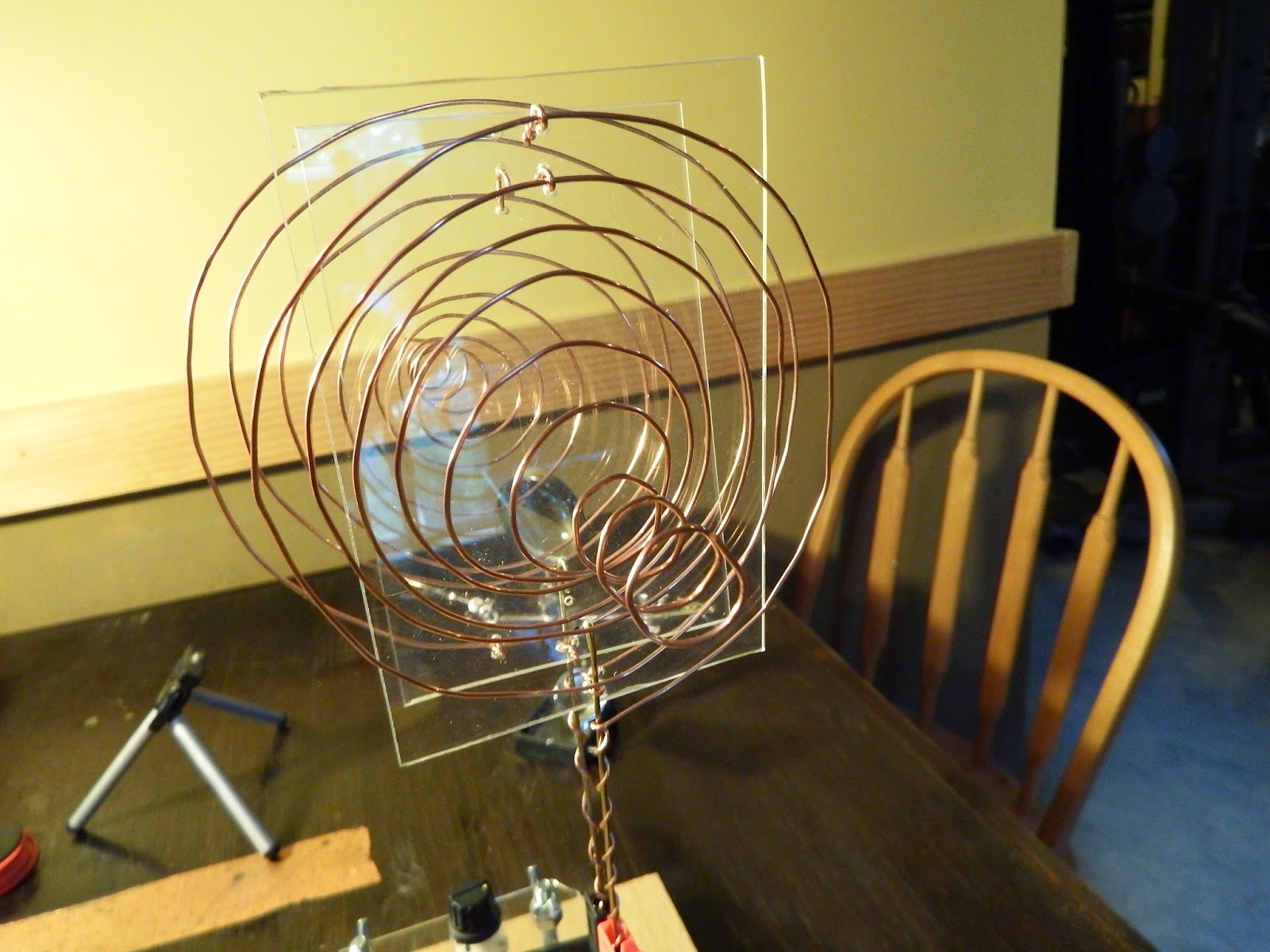 Why spiral antennas? Because Tesla's drawing and notes are littered with spirals. The man loved a spiral or two. That's a bit of homage to him, it was a shape I could easily create with six feet of copper wire, and since this project is as much about fun and art as it is about anything else, why not a spiral?
