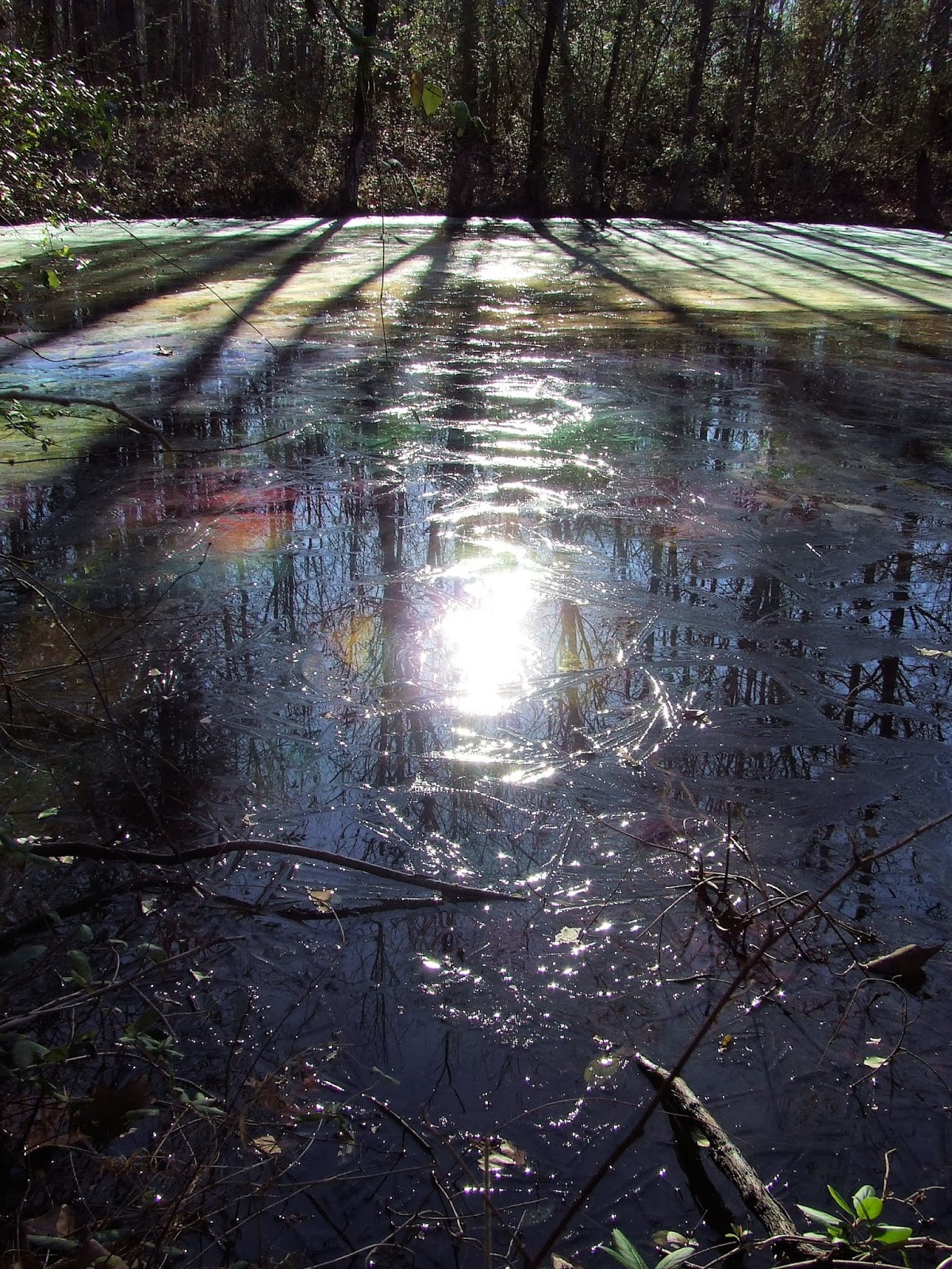 That's ice. Shaded water remained frozen all day, which means the nine-foot-long water moccasins with heads the size of piglets are all snug in their winter beds, dreaming whatever it is that venomous monsters dream.