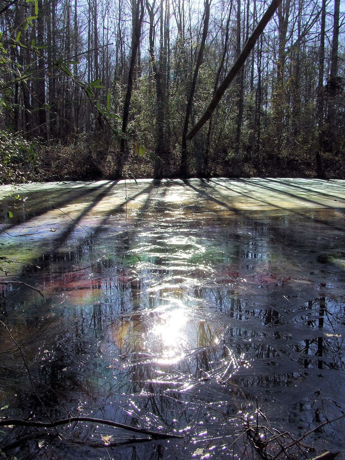 Finally, yet another in my acclaimed series, Pond Scum Afternoon. If the sun is low enough, I guess the rays are refracted off the mixture of ice and scum, producing both a rainbow effect of colors and probably a spate of UFO sightings in the next county.