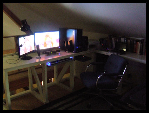 And yeah, I built the desk right into the room. It's nothing fancy -- 2 by 4s and 3/4 inch plywood. You can tapdance on it, if you want, and it won't budge or flex.