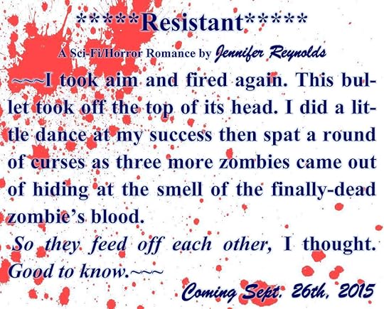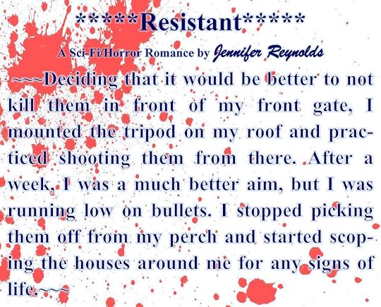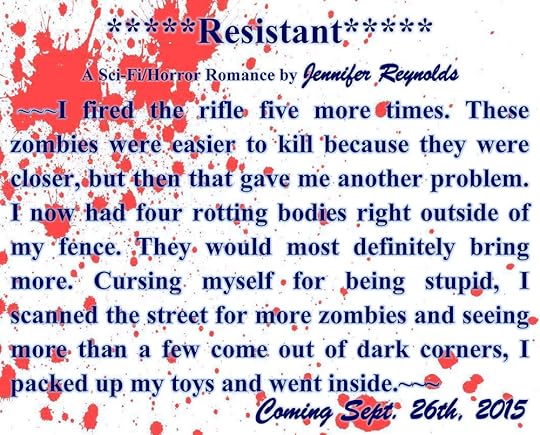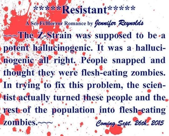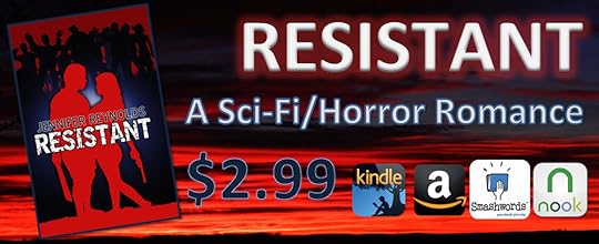 *****New Release*****Resistant, a Sci-Fi/Horror Romance*****$2.99*****Before the outbreak, Sahara was a high school teacher living alone in a small Alabama town. She saw her life as nothing more than endless days of teaching children Shakespeare and nights reading paranormal romances. She was happy with her life, as quiet and mundane as it was.After the outbreak, Sahara becomes a warrior traveling across the country in search of sanctuary. She spends her days and nights killing zombies, searching for food, trying to maintain her sanity, and if Daniel has his say, finding love.How will Sahara help those who are left find safety and stability in a world full of nightmares? Will she stop resisting the man she loves and open her heart, knowing that he may not live through the next second let alone the next year? Join Sahara and her people in a fight against creatures set out to devour them and the unknown threat controlling them to find out.#jenniferreynolds #resistant #romance #scifi #horror #ebookhttp://www.amazon.com/Resistant-Jennifer-Reynolds-ebook/dp/B014TAMTA0https://www.smashwords.com/books/view/576968https://www.allromanceebooks.com/product-resistant-1891118-171.htmlhttp://www.barnesandnoble.com/w/resistant-mrs-jennifer-lynn-reynolds/1122653906?ean=2940152358179https://store.kobobooks.com/en-us/ebook/resistant-5https://itunes.apple.com/us/book/resistant/id1041018211?mt=11https://www.goodreads.com/story/show/402724-resistant?chapter=0https://www.goodreads.com/book/show/26101354-resistantResistant Excerpt