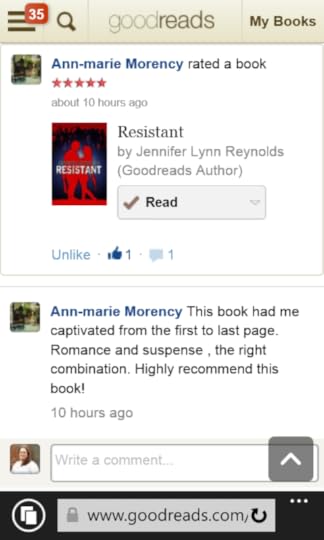 *****New Release*****Resistant, a Sci-Fi/Horror Romance*****$2.99*****Before the outbreak, Sahara was a high school teacher living alone in a small Alabama town. She saw her life as nothing more than endless days of teaching children Shakespeare and nights reading paranormal romances. She was happy with her life, as quiet and mundane as it was.After the outbreak, Sahara becomes a warrior traveling across the country in search of sanctuary. She spends her days and nights killing zombies, searching for food, trying to maintain her sanity, and if Daniel has his say, finding love.How will Sahara help those who are left find safety and stability in a world full of nightmares? Will she stop resisting the man she loves and open her heart, knowing that he may not live through the next second let alone the next year? Join Sahara and her people in a fight against creatures set out to devour them and the unknown threat controlling them to find out.#jenniferreynolds #resistant #romance #scifi #horror #zombie #ebookhttp://www.amazon.com/Resistant-Jennifer-Reynolds-ebook/dp/B014TAMTA0https://www.smashwords.com/books/view/576968https://www.allromanceebooks.com/product-resistant-1891118-171.htmlhttp://www.barnesandnoble.com/w/resistant-mrs-jennifer-lynn-reynolds/1122653906?ean=2940152358179https://store.kobobooks.com/en-us/ebook/resistant-5https://itunes.apple.com/us/book/resistant/id1041018211?mt=11https://www.goodreads.com/story/show/402724-resistant?chapter=0https://www.goodreads.com/book/show/26101354-resistant