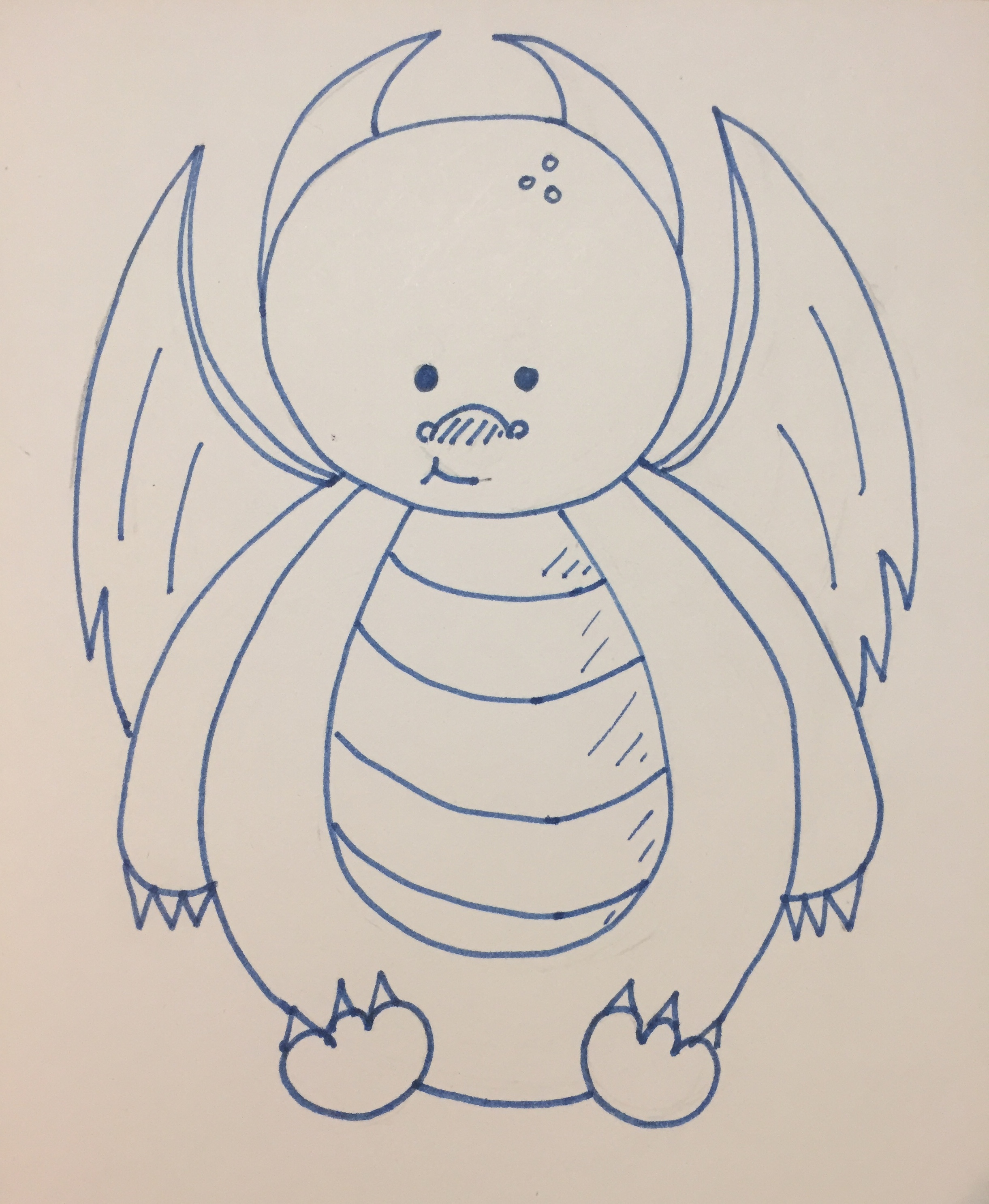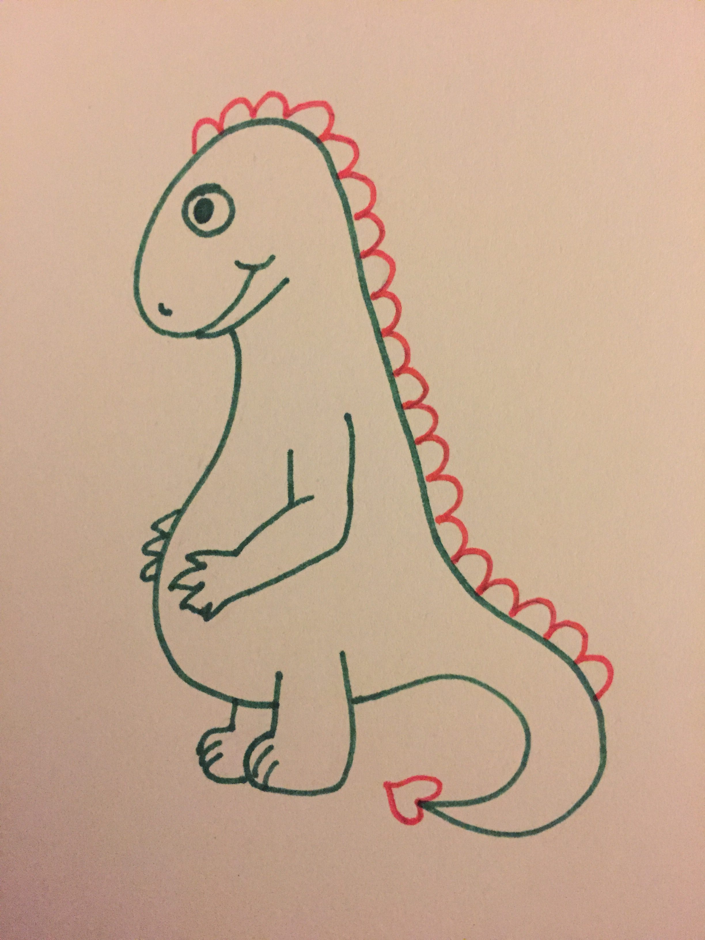 I love his little tail. I know! I’ll add a red heart on the end. Oh that is the best. And I’ll make his smile smirkier. And I’ll give him red spine bumps and a cute little belly.