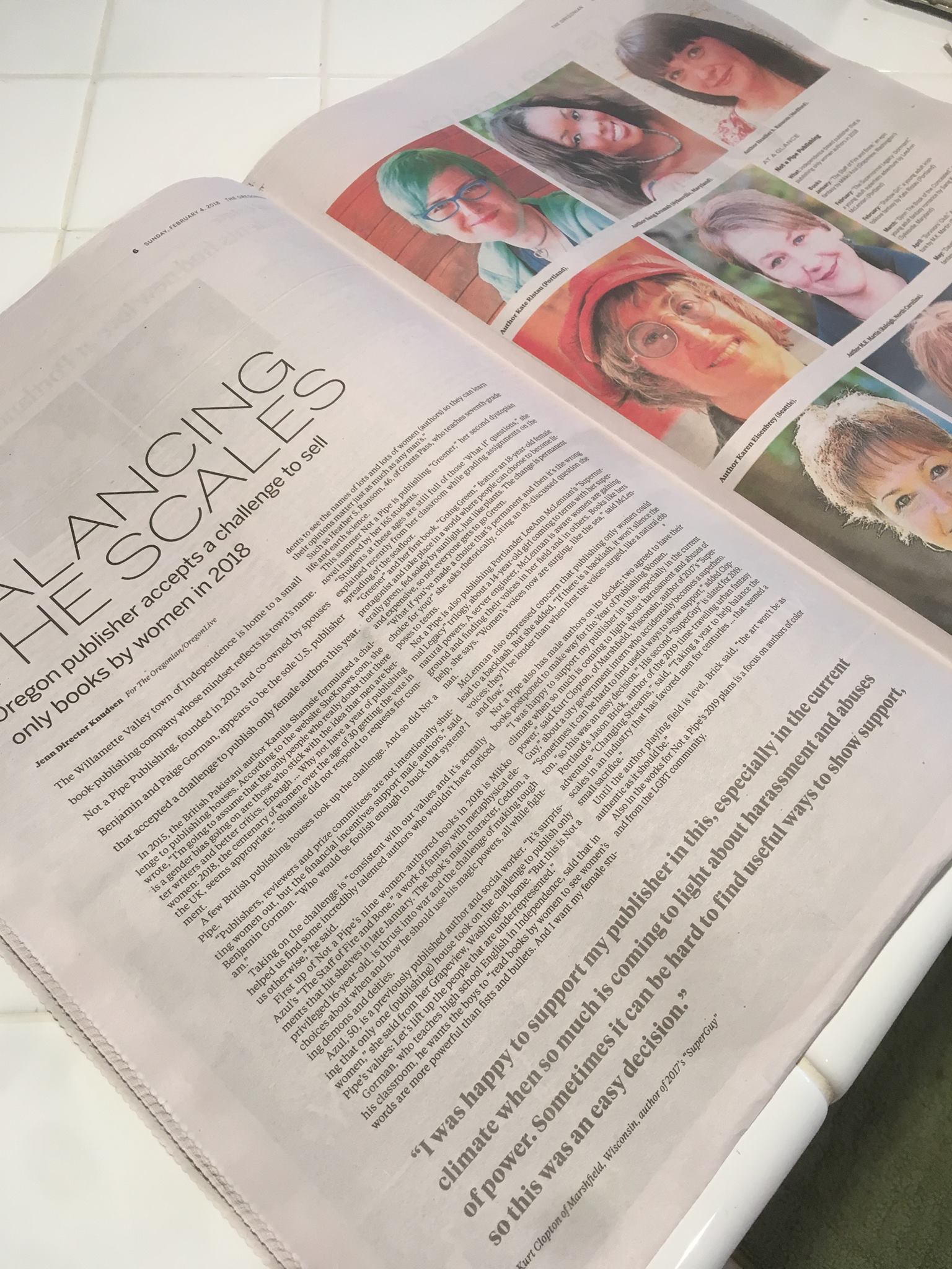 The sun was shining. We sat down in the backyard swing. We pulled up the remains of the tomato plants. We ate chives that just emerged from the emptiness of winter. And, in case you missed it, there was a great article in the Oregonian today about my new publisher, Not a Pipe Publishing.