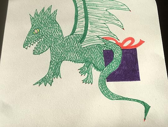 I wanted to draw Bob a dragon for his birthday. You know, with it’s tail coiled around a present? But then, well, the dragon kind of SAT on the present. And then I ran out of room for the wings. And the head was too big. And the lines of the dragon were too dark. So I added scales. Too make it look less weird.