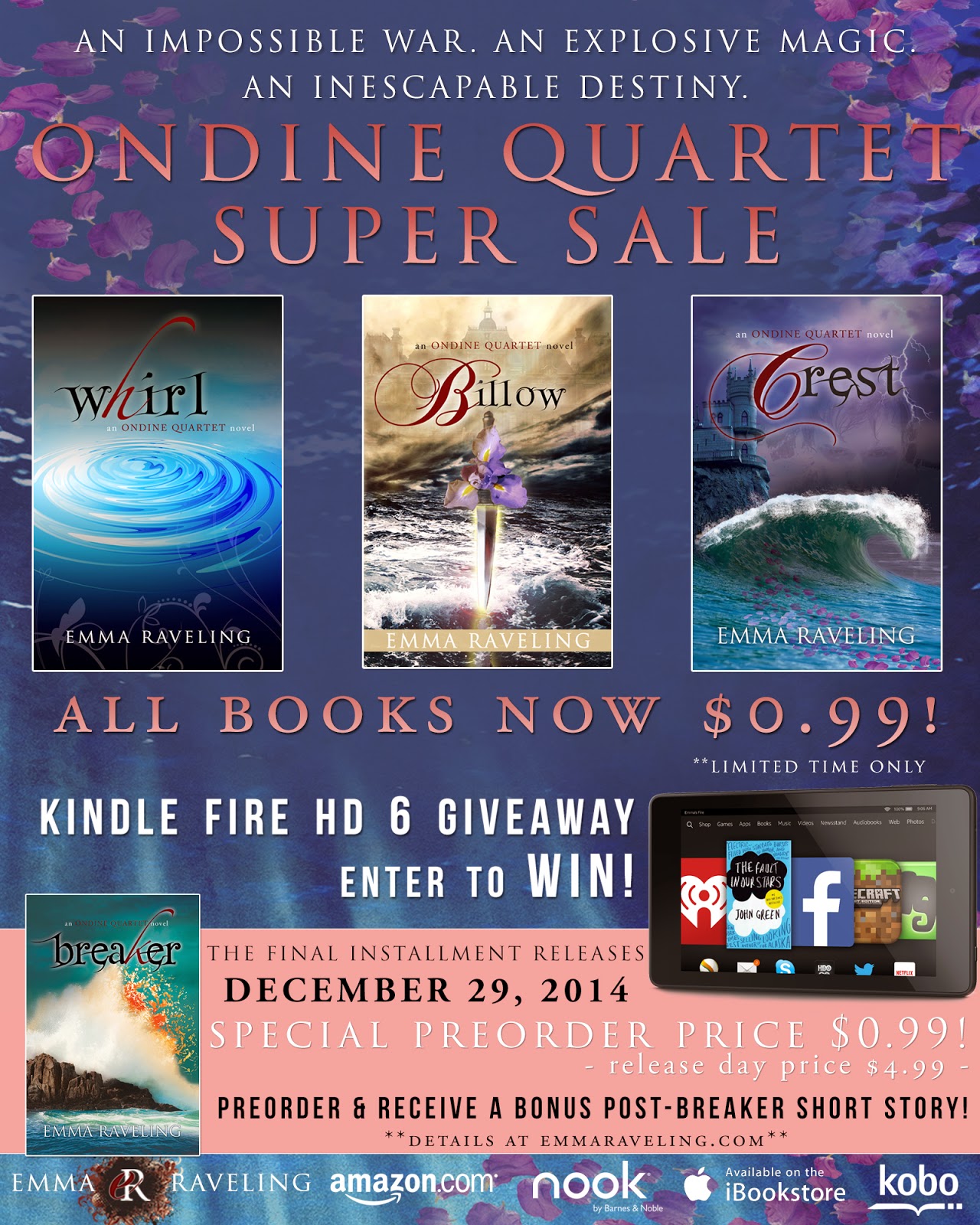 It's the Ondine Quartet super sale! Buy the first three books (Whirl, Billow, Crest) in this thrilling, action-packed, mature young adult urban fantasy series at 0.99 cents each for a limited time! Preorder Breaker and get it at only .99 cents, it'll be $4.99 on release day. That's less than $4 for the full Quartet! You can also enter to win a Kindle Fire HD 6 in the celebration giveaway!
