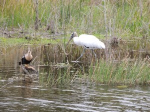 The female Anihinga on the left has adopted a patch of reeds just across from our house and can usually be found there. Even a curious Wood Stork doesn’t faze her.