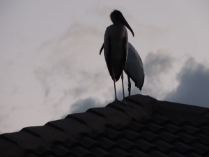 Another large bird standing 3 to 4 feet tall, Wood Storks seem to enjoy each other’s company. When we first arrived we saw Wood Stork parades each morning, sometimes as many as 7 lumbering along the waterfront together. But this photo of our neighbor’s roof at twilight is my favorite.
