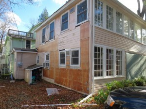 Here’s the back of the house stripped of siding. We’re building a two story addition of bathrooms and closets on both levels.