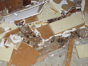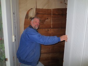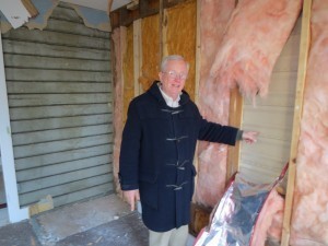 You find interesting things when you remove walls. Here, our wonderful architect is pointing out that there is nothing between the insulation and the vinyl outdoor siding, plus the insulation was installed backwards.