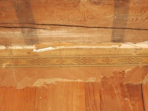 Last but not least, look what was revealed when the insulation board was removed. A snippet of the original wallcovering. Wallpaper? Oil cloth? Glad I could get a photo.