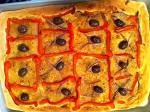 The final product was good, and attractive–see photo above. But would I make it again? Well, the bottom was soggy, but I can't blame this on the cookbook, since I deviated in the way I baked it. And though I enjoy anchovies and olives, I found this a bit salty for my taste, even with the contrast of the sweet caramelized onions. I also learned a lesson about anchovies and other people's appetites. Add all that to the time it took and next time, I think I'll wait until I get to France and eat my fill of pissaladiere at a lovely little sidewalk cafe with a glass of good wine.