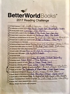 In 2017 Better World Books, an online bookstore that works to support literacy, created twenty-five reading categories. Those of us who accepted the challenge had a year to find books that fit and read them all by year’s end.