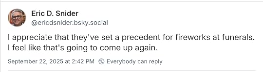 Welcome back to another installment of my monthly newsletter! There’s September just about behind us, which puts us that much closer to Halloween and Thanksgiving. Thankfully not much of real significance happened this month. I mean, I guess some bigoted, right-wing, white supremacist, windbag nutjob who advocated for gun violence got himself taken out by another right-wing nutjob in a targeted act of gun violence. Not exactly a big loss for humanity all in all. I’m sure he’ll be just as forgotten as Rush Limbaugh and Saddam Hussein soon enough, despite the efforts of other right-wing nutjobs holding political office trying to score points with their base by doing even more fascism than usual. On the bright side, following Trump’s usual narcissism to make the funeral all about himself, complete with fireworks, film critic Eric D. Snider noted on Bluesky: