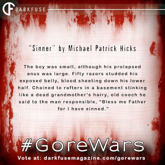 Thanks to all the wonderful sickos who voted in the first round of GoreWars over at DarkFuse Magazine, Pucker Up was one of the winning stories and I am now in round two with a fresh story called Sinner. I'll be squaring off against dark poet Timothy P. Flynn, who was one of the top vote-getters in round one, so I'm expecting some stiff competition here (Update: After being tied half-way through day one, Timothy squeaked out a bit of a lead. Things are heating up! The score is currently 355-308, and this is looking like the match to watch.)
