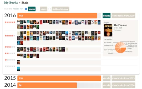 THE STATSNumber of books read: 112Number of pages read: 21,020 Longest Book read: The Fireman by Joe Hill Shortest book read: The Approach by Chris Holm Audiobooks listened to: 21 THE RATINGS5-star reads: 334-star reads: 54 3-star reads: 16 2-star reads: 7 1-star reads: 1 Did Not Finish (DNF): 1A note on those ratings: some of these reads were borderline and would have garnered a lower half-star rating. Since Goodreads doesn't provide a metric for half-star ratings, I rounded up. So, some of those 5- and 4-star reads should more accurately be reflected as 4.5 and 3.5, respectively. Ditto the lower ratings, as well. But, again, Goodreads does not make such allowances and I typically erred on the side of generosity.