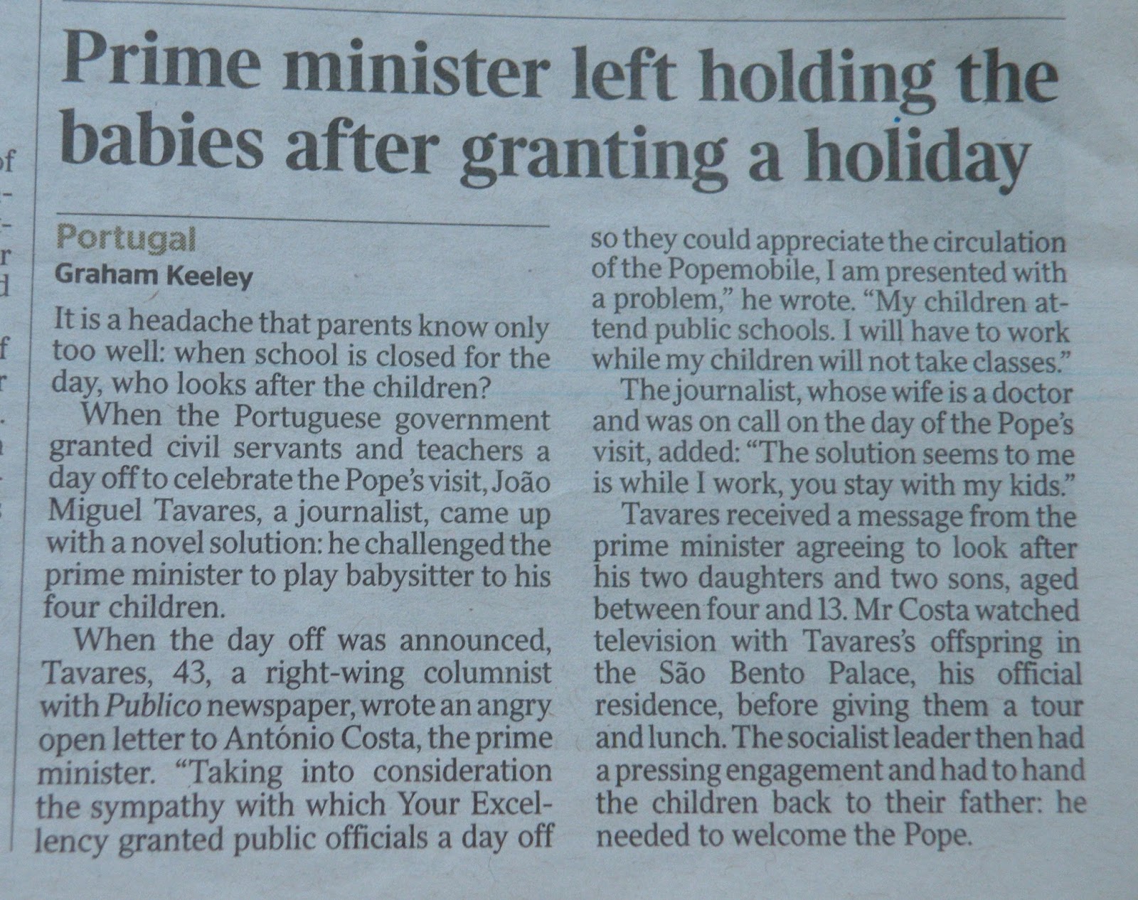 As a former journalist I relish unusual stories in newspapers and this one in The Times takes some beating. When the Portugese government granted civil servants and teachers a day off to celebrate the Pope's visit recently, journalist Joao Miguel Taveres was very unhappy. Both he and his wife had to work on the day of the visit, so he asked the prime minister to 'babysit' his own four children.