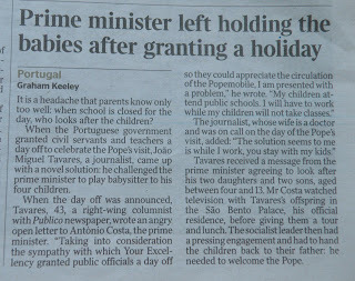 As a former journalist I relish unusual stories in newspapers and this one in today's Times takes some beating. When the Portugese government granted civil servants and teachers a day off to celebrate the Pope's visit recently, journalist Joao Miguel Taveres was very unhappy. Both he and his wife had to work on the day of the visit, so he asked the prime minister to 'babysit' his own four children.