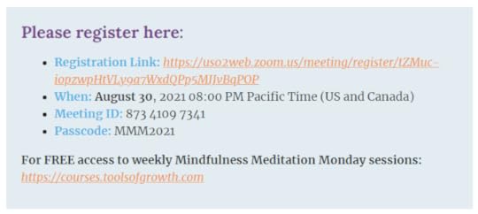 You can scroll through my blog posts or even experience the practices that we have done so far for FREE on my School Of Growth platform by simply clicking on Mindfulness Meditation Monday. Each session is separate yet connected to the rest. You can join in anytime! Or you can start by joining in (for FREE) today, for just 30 minutes. Simply click on the registration link below.