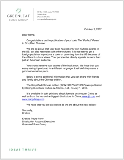 Three years ago, on October 1, 2014, my first book, The “Perfect” Parent: 5 Tools for Using Your Inner Perfection to Connect With Your Kids, was published by the Greenleaf Book Group. Thanks to your support, this journey has been full of surprises and unexpected gifts. Besides having received four top industry awards and recommendations by Publisher’s Weekly and Library Journal, I am pleased to announce that my book is now available in Simplified Chinese.