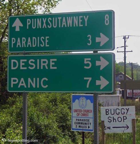 On State Route 119 between Big Run and DuBois stands an interesting and somewhat amusing highway sign, giving the direction and mileage to some area towns: Panic, Desire, and Paradise. Yes, those are real names of real towns here in western Pennsylvania.