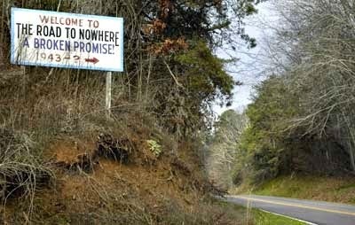 Although eventually the environmental issues were resolved and the feds paid the county $52 million in lieu of finishing the road, the locals, feeling betrayed, renamed Lakeview Drive to “The Road to Nowhere.” A sign was erected: “Welcome to The Road to Nowhere. A Broken Promise. 1943 – ?”