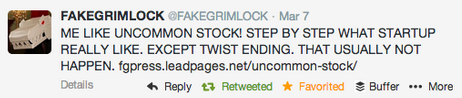Do something cool. It’s easier to get coverage and social media amplification if there’s more to talk about than the simple fact that it’s launch day. I created a Twitter account for Uncommon Stock’s protagonist (@MaraWinkel) and incited a Twitter battle with a few people with large followings. Heck, we even built a website for Mara’s startup and a major venture capital firm announced an investment in the fictional company. This introduced new people to the story and was a talking point in itself.Do something cool. It’s easier to get coverage and social media amplification if there’s more to talk about than the simple fact that it’s launch day. I created a Twitter account for Uncommon Stock’s protagonist (@MaraWinkel) and incited a Twitter battle with a few people with large followings. Heck, we even built a website for Mara’s startup and a major venture capital firm announced an investment in the fictional company. This introduced new people to the story and was a talking point in itself.All format release. Make sure your book is available in digital and print formats on launch day. I didn’t do this because we were slow getting the print version through typesetting and I know it resulted in significant lost sales. I’ve also had a couple dozen people reach out to ask where they can get the print copy (so there must be many more that didn’t reach out). That sucks. I want to DELIGHT my readers in every possible interaction they have with me.Recruit a cadre of advance reviewers. The more reviews you can get on Amazon as soon as possible the better. I sent advance review copies out to ~50 people a couple of weeks before launch. Then I pinged those people shortly before launch day reminding them how useful an honest review from them would be. Then I reminded them on launch day that now was the time! We debuted with 28 reviews.Be strategic. Choose Amazon categories that are specific and not too competitive. Reach out to your alma mater and try to get in the alumni newsletter. Pitch low-lying bloggers or reporters with concise, compelling stories. Snag some endorsements from folks that have actually read your book. Etc.Write another good book. There’s nothing more important than building a backlist. It gives fans more of what they want. It gives prospective readers a new path to discovering you. Plus, writing books is why you’re doing all of this anyway!There are more details available on how launch week went for Uncommon Stock here. If you’re interested in an adventure through the world of tech startups, read it!
