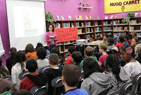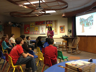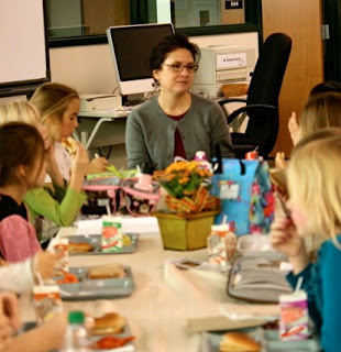 The day started with lunch in the library. Two students each, from grades 1 -4, were chosen to have lunch with the author, based on a paragraph they wrote about their love of books or reading. (And how did they know I love chocolate cake??)