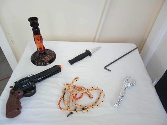 I had to improvise a little with the weapons, of course. We had a candlestick, a (toy) knife, a “lead pipe” (tent peg), (toy) gun, rope, and wrench (made out of foil).