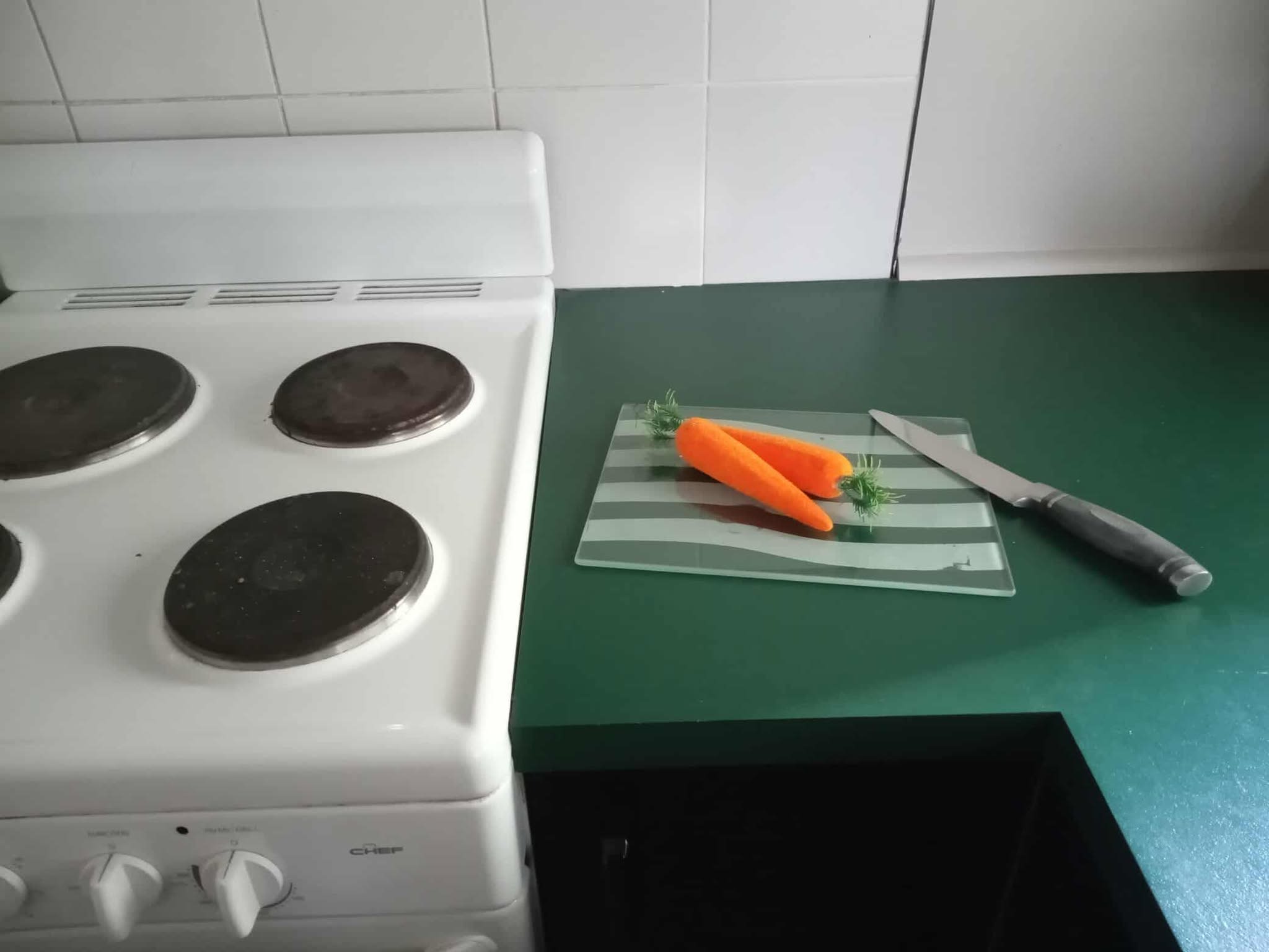 I used my kitchen as the kitchen (whoa! crazy!!), but for the photo I set up a chopping board with fake carrots and a large knife, because this is something visible on the kitchen bench in the game.